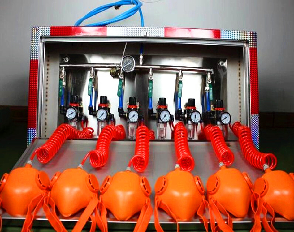 本款產(chǎn)品主要是由外管系統(tǒng)、壓風(fēng)接口、進(jìn)氣閥、進(jìn)氣連接管、供氣量調(diào)節(jié)裝置、氣動(dòng)減壓閥、排水裝置、面罩等構(gòu)成。